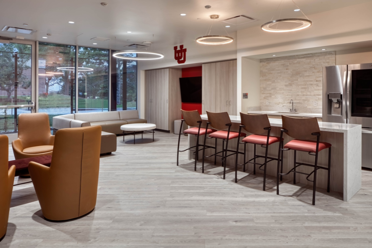 Key features of the new facility include a sauna room, a second-floor observation patio, and a concealed first-floor patio with a green screen living wall for privacy. Additional enhancements include a new locker room with a ceiling-mounted logo, a players’ lounge, coaches’ and staff offices, and an inviting entrance lobby with curtain wall glazing and an elevator.