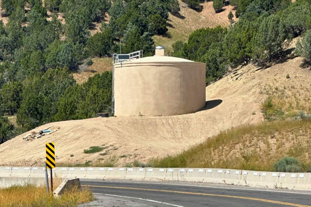 A new water system featured a well, a control building, and a 200,000-gallon water tank. On the hillside where the tank was constructed, we built two shelves where the tank precast wall panels with the metal diaphragm liner could be constructed. The 200,000-gallon water tank, a unique 20’ high 40’ diameter type III concrete design with a metal diaphragm, was constructed by a specialty contractor from Kentucky. The tank’s walls, featuring a wire-wrapped design, were poured, cured, stood, and post-tension wrapped with three layers of cable. Along with a self-supporting concrete dome roof and shotcrete coating on the exterior, the advantage of this unique type of tank construction is that it allows for stress, thermal, and load expansion without cracking or leakage.