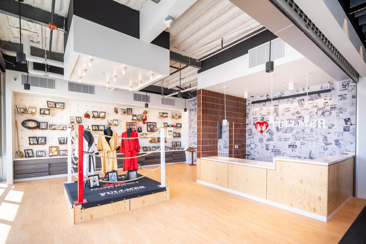 The Hall of Fame museum preserves the Fullmer brothers’ history through curated memorabilia, custom display walls, and archival graphics that immerse visitors in the story of the family’s world-championship legacy and contributions to Golden Gloves boxing. Warm lighting, exposed steel, brick, and durable finishes intentionally evoke an “old-school” boxing gym while still elevating the environment for tournaments, rentals, and community gatherings, reflecting Gramoll’s focus on craft, function, and long-term durability.