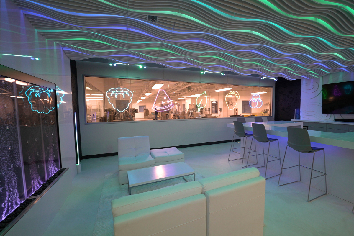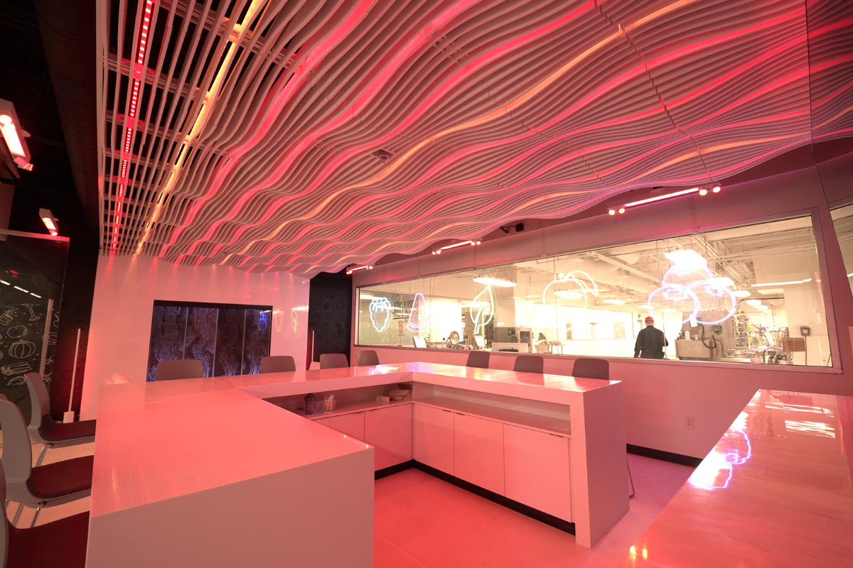 The renovation also included the addition of a Tasting Lounge, complete with an illuminated wrap-around bar, felt vertical acoustical panels, and epoxy flooring. In the open lab area, new features such as a high-end cooking kitchen and a vibrant LVT rainbow accent wall and ceiling were installed to promote creativity and collaboration.