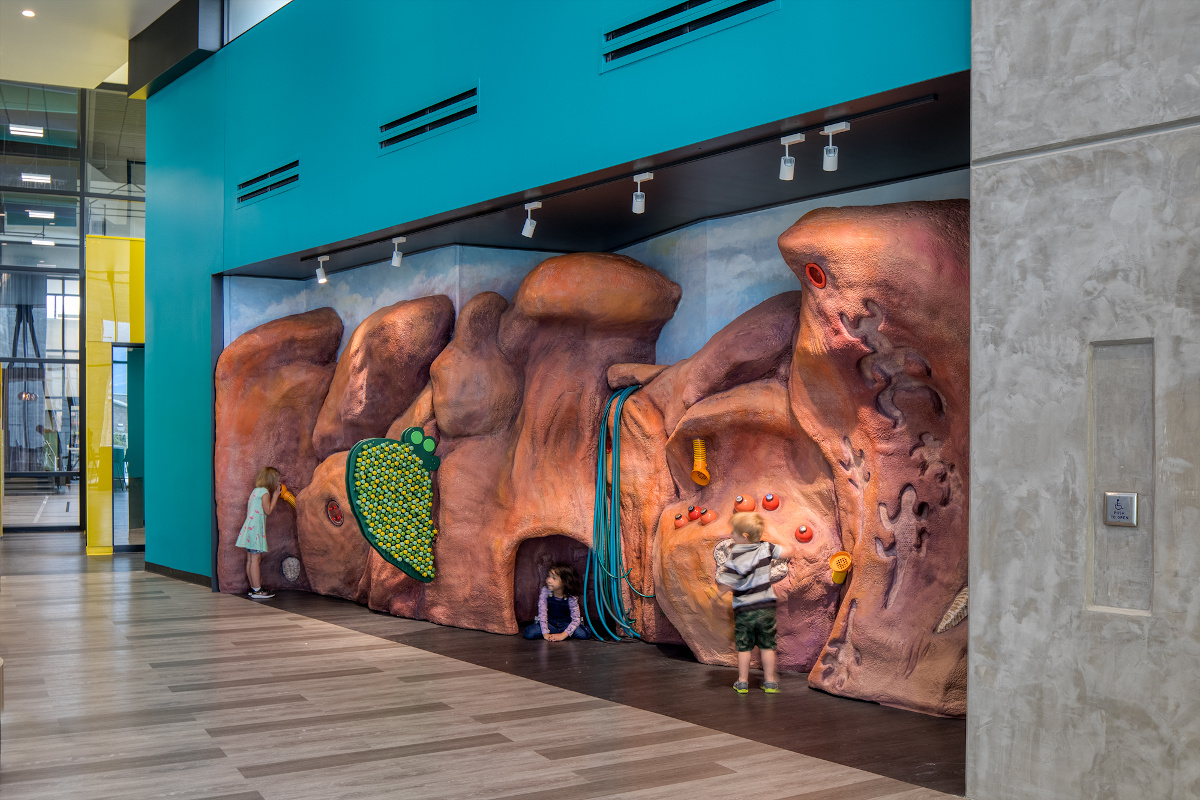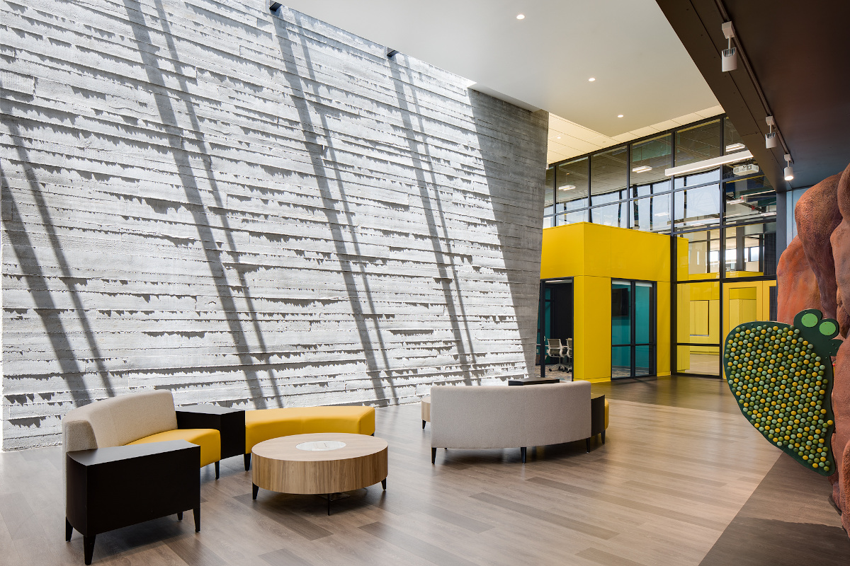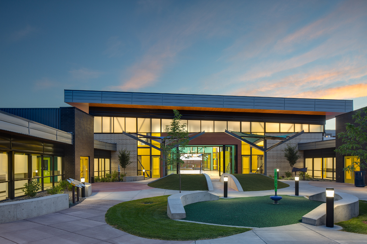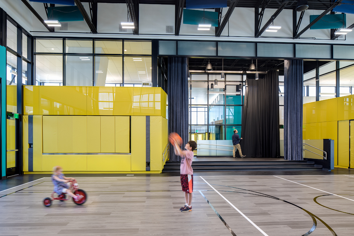 After developing several possible schemes and considering options including one that looked like a Q and another that had 4 courtyards, the best concept presented itself as a central spine flanked by classrooms and a courtyard on each side. The spine separates the preschool and elementary courtyards and classrooms to accommodate developmental needs, but by placing the gymnasium at the heart of the building, sliding doors are incorporated, thus allowing the space to open up to both courtyards when desired. While many materials chosen were very similar to OEC, this school incorporates yellow as the focal color, and utilizes a large board-formed concrete wall slicing through the building not only as a wayfinding /textural element but as an opportunity to create entry courtyards to bring the scale down and focus the senses.