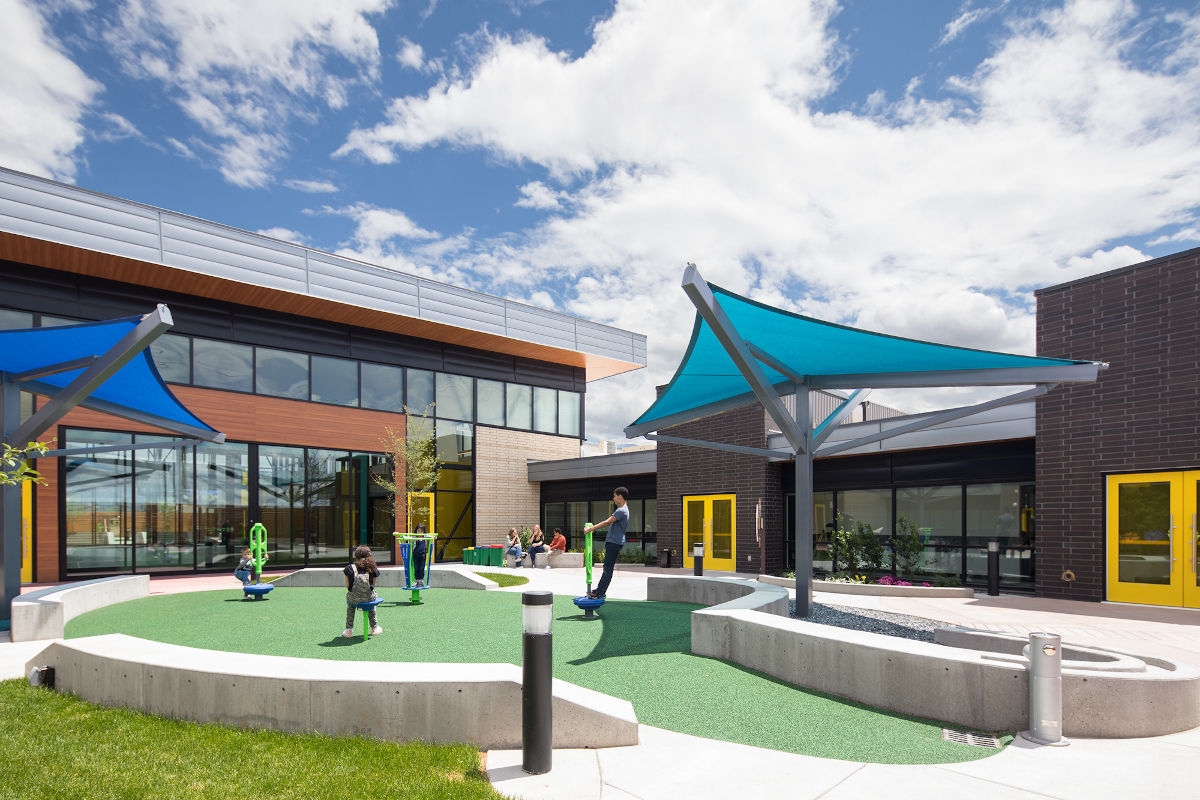 The playgrounds are designed to be navigable for students who are blind and were created without wood chips so that students in wheelchairs can use them. The school also includes a sensory garden for students who are blind.