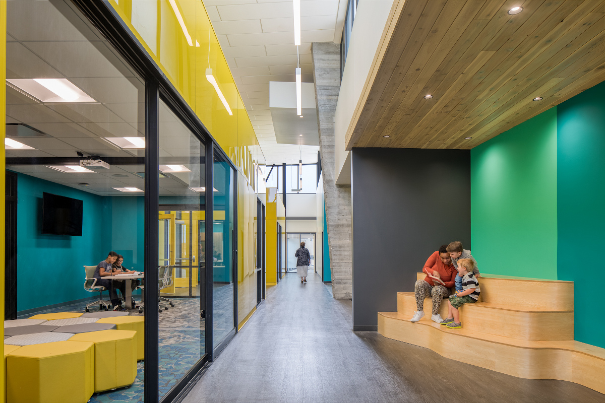 The school includes architectural features to help students who have hearing or vision loss navigate the facility. Those include wide open spaces so students can sign to each other, contrasting colors to help the vision impaired locate parts of the school and floor materials that change so that students who use canes know where they are.
